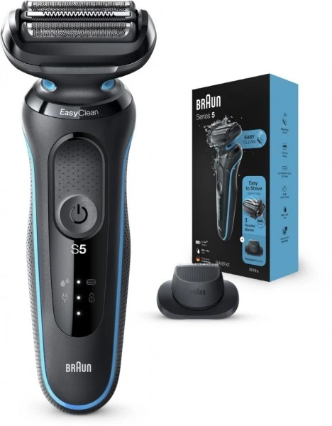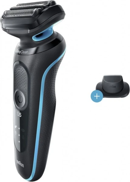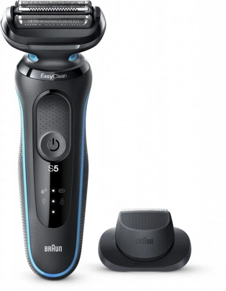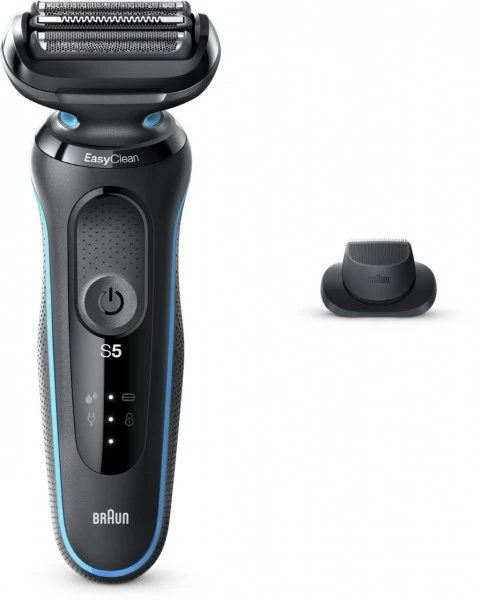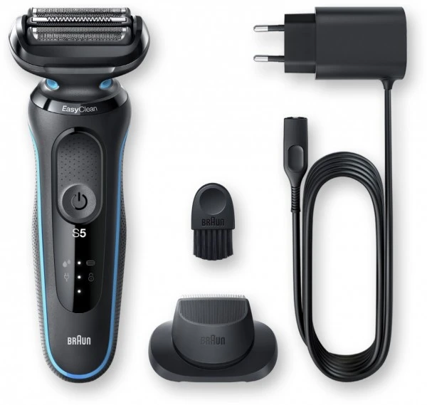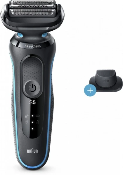 Der Braun Series 5 Elektrorasierer für Männer erleichtert die Rasur mit 3 >exiblen Klingen, die sich an Ihre Gesichtskonturen anpassen. Das EasyClean System bietet eine schnelle und einfache Reinigung, ohne Abnahme des Scherkopfs. Der Lithium-Ionen-Akku ermöglicht ein Rasieren von bis zu 3 Wochen und eine 5-minütige Schnellladung, die für eine Anwendung reicht. Dieser elektrische Rasierer für Herren ist 100% wasserdicht und für die Nass- und Trockenrasur geeignet. Kompatibel mit EasyClick System. Inklusive Präzisionstrimmer- Aufsatz.