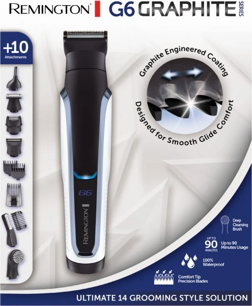 Mit dem Graphite Series G6 Multigroomer verabschiedet man sich von den endlosen Stylingwerkzeugen im Bad. Mit den insgesamt 10 Aufsteckköpfen und -kämmen können 14 verschiedenen Styles für Kopf, Bart, Gesicht und Körper erzielt werden. Die graphitbeschichteten Klingen schonen die Haut während der Pflege und die selbstschärfenden Klingen gewährleisten eine präzise Schneidleistung.
