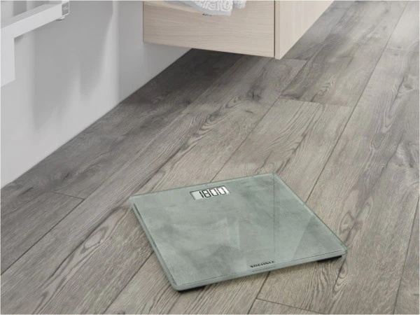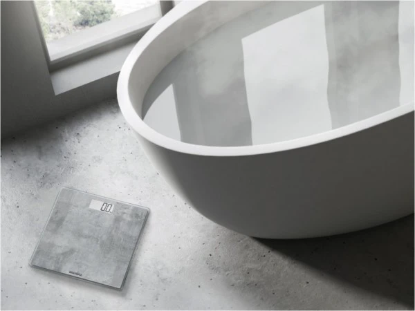 Die digitale Personenwaage Style Sense Compact 300 Concrete ist mit ihrer stilvollen Beton-Optik ein Blickfang in jedem Badezimmer. Mit ihrer groĂen TrittflĂ€che aus hochwertigem Sicherheitsglas bietet sie einen komfortablen und sicheren Stand. Auf der gut lesbaren LCD-Anzeige kann das Körpergewicht in prĂ€zisen 100-g-Schritten abgelesen werden. Neben der sehr hohen Tragkraft bis maximal 180 kg ĂŒberzeugt die Waage durch die automatische Ein- und Ausschaltfunktion. Das fest verschraubbare Batteriefach macht die Waage besonders kindersicher. Inklusive Batterien.